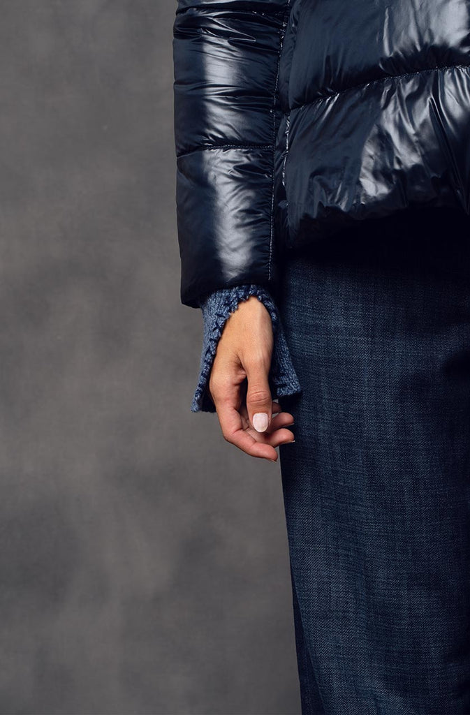 Diese Daunenjacke von Herno kombiniert modernen Chic mit wärmender Funktion – ein Must-have für stilbewusste Wintertage. Das glänzende Obermaterial in edlem Nachtblau verleiht dem Look eine luxuriöse Note. Mit goldfarbenem Zwei-Wege-Reissverschluss und dezenten Seitentaschen ausgestattet, kombiniert diese Jacke Komfort, Funktion und Stil auf höchstem Niveau.