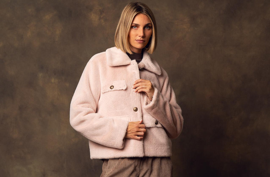 Diese Jacke vereint weiche Haptik mit klarer Linie. Der kurze, strukturierte Schnitt erinnert an eine moderne Hemdjacke, während das sanfte Rosé dem Look eine elegante Ruhe verleiht. Das flauschige Material fängt das Licht dezent ein und sorgt für eine luxuriöse, warme Ausstrahlung. Mit Kragen, dezenten Knöpfen und aufgesetzten Taschen wirkt sie lässig, aber gepflegt – ein Statement für moderne Weiblichkeit mit Sinn für Stil und Komfort.
