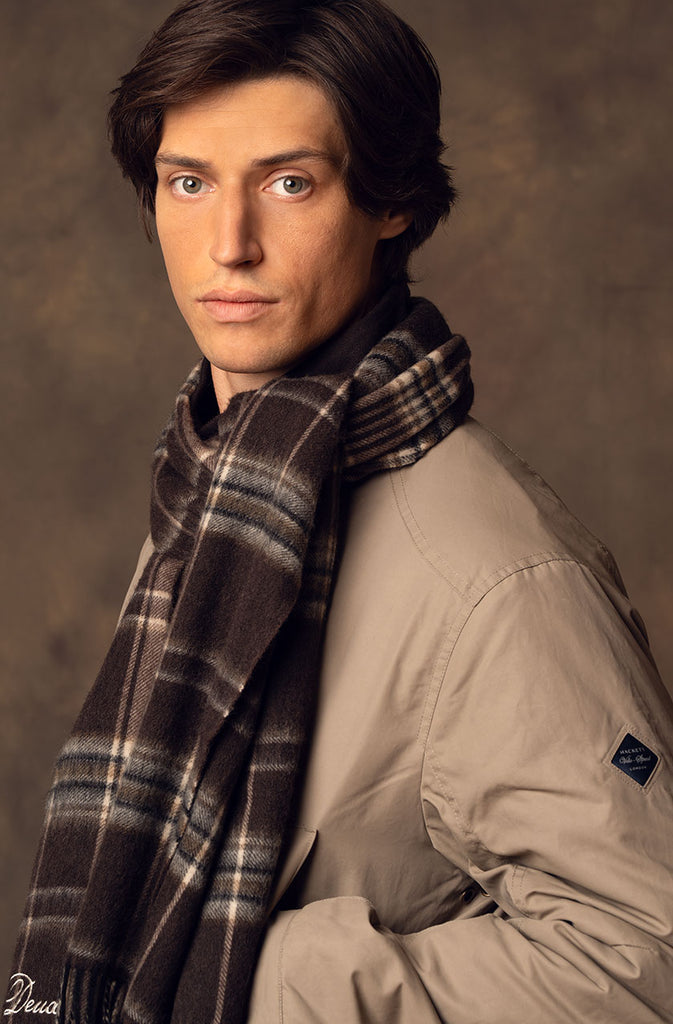 Ein Schal, der Wärme und Stil mühelos verbindet. Das klassische Karomuster in Braun- und Beigetönen verleiht dem Look Tiefe und Charakter – ein dezentes Statement, das zu jedem Outfit passt.